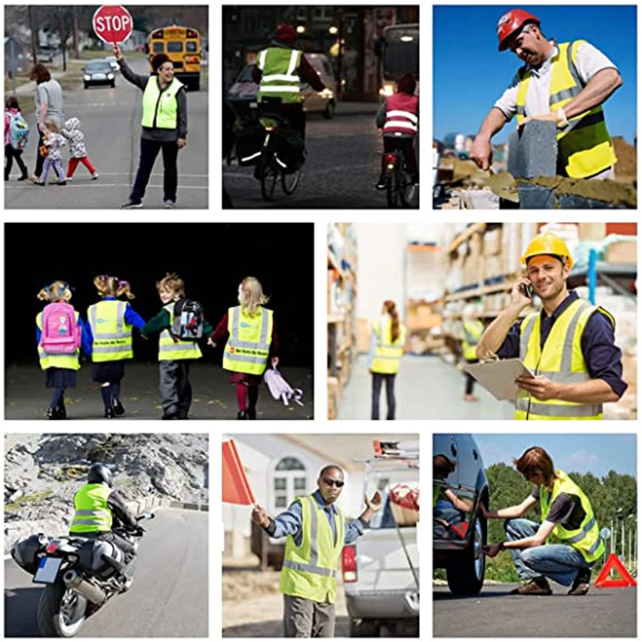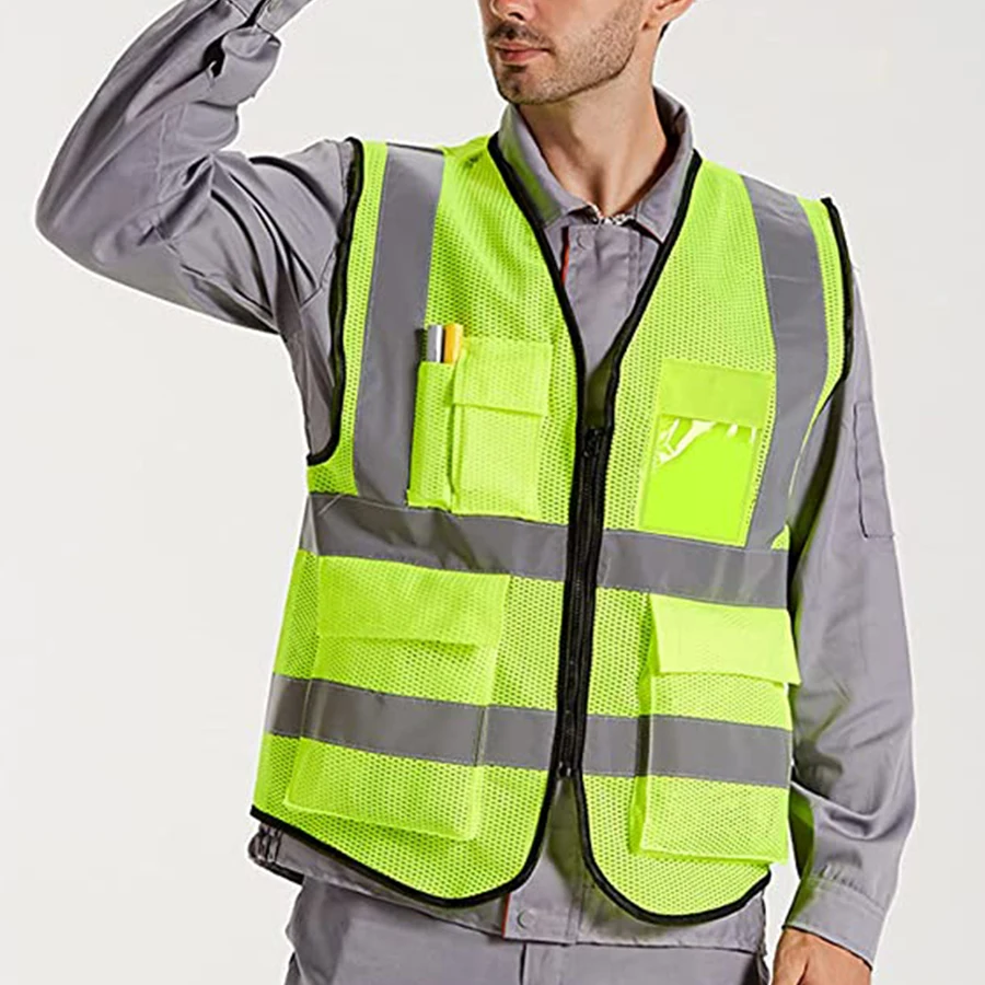 سترة أمان عالية الوضوح مزودة بأشرطة عاكسة عريضة تغطي 360 درجة لضمان الرؤية من جميع الزوايا.